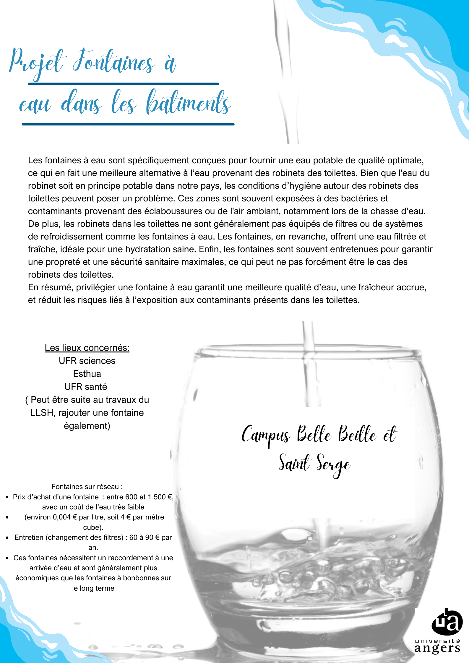 Nous aimerions installer 5 fontaines sur les sites de l'ESTHUA, de la Faculté de Santé (site Amsler) dans le hall des amphithéâtres, sur le bâtiment UFR Sciences et pourquoi pas sur le nouveau bâtiment LLSH lorsqu'il sera terminé.